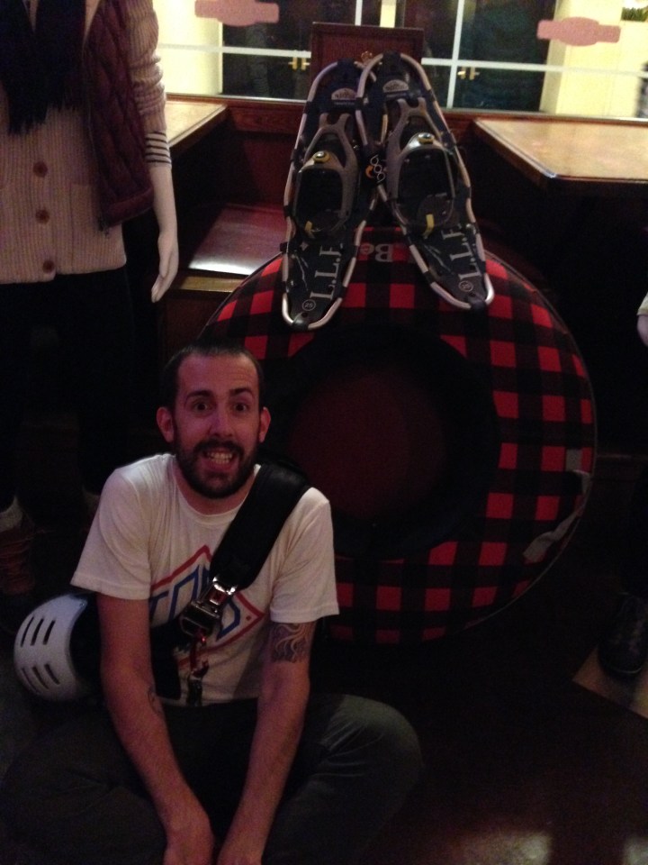 Before sending everyone off to the screening, Seth and Rob summoned everyone to the front of the room. They thanked everyone for coming, L.L. Bean for hosting such an event, then began a small raffle using tickets everyone submitted upon event entry. I’m not one to win anything (says everyone), but I was particularly interested in this. The small group increased my odds and the crappy bar PA added to the suspense by cutting out every couple minutes. I was captivated. After a few prizes were awarded to people other than me, hope wavered. Then I won. The prize was an extra large snow tube. (Well, technically, it was a gift card for the exact price of the tube, but WHY WOULD I BUY ANYTHING OTHER THAN A SNOW TUBE?!?)