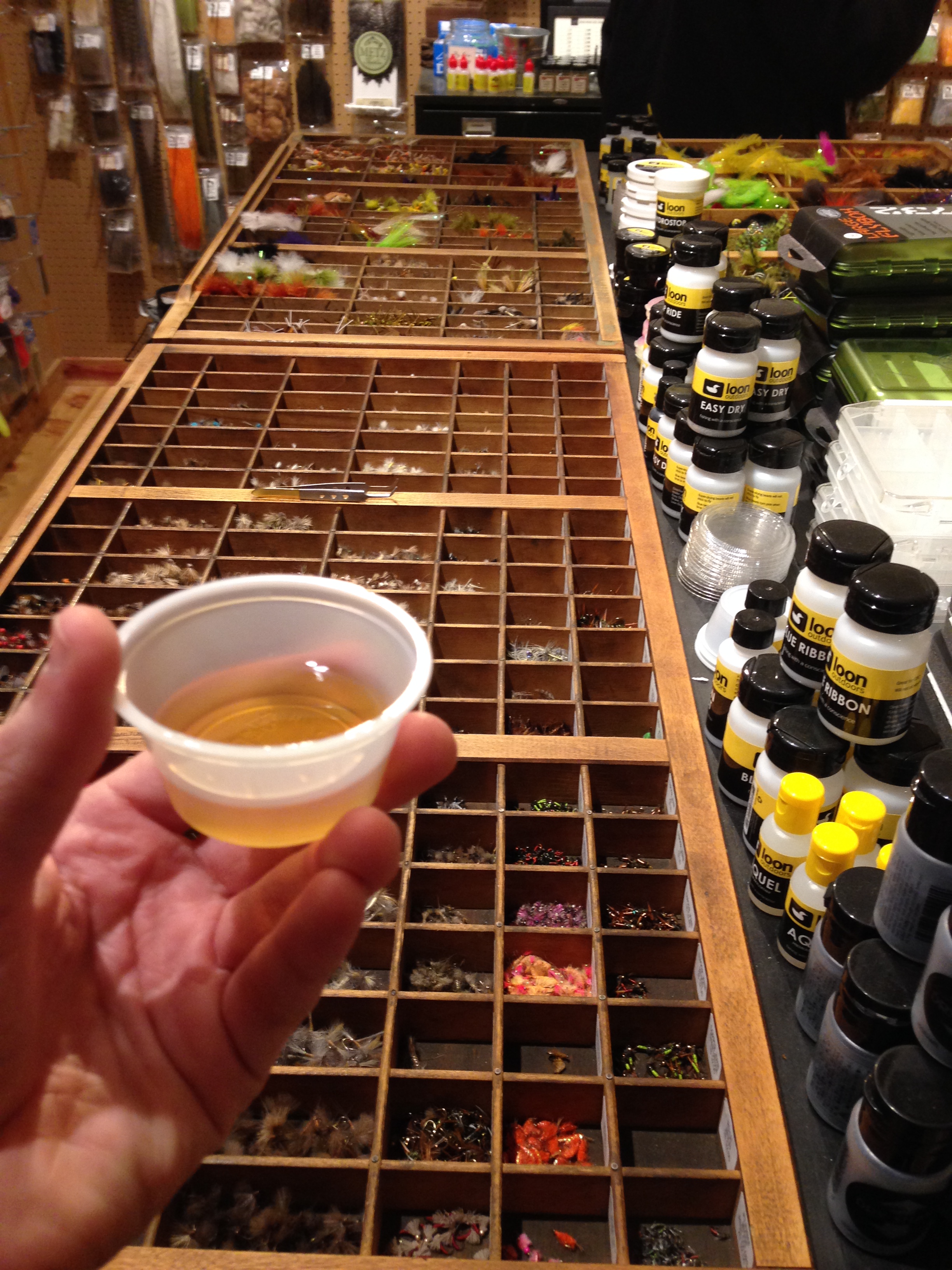 Without proper shot glasses, we improvised by using 2 oz. cups reserved for buying flies. I mean, it’s all part of the experience, right? Side note: If you know anyone with a fly shop, convince them to invite 30 people; serve free High Life, whiskey and PBR; hire a dude to play a steel guitar and harmonica; and have a good time. A fly shop is the best venue for such a gathering.
