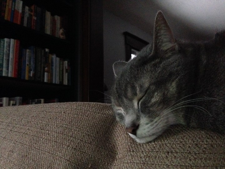 If you’ve read this far, here is a photo of the aforementioned gray cat. I’ve been spending excessive time on the couch recovering and she can usually be found sleeping on or near me. Her name is Sprite.