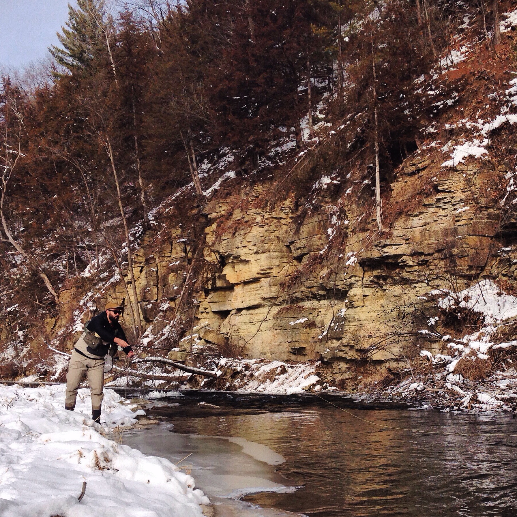 We spent the morning fishing along the sunny bluffs of the Whitewater River. The temperature was just below freezing and the sun warmed our bones. Cloudy, foggy days have been commonplace this year; a sunny day is something to enjoy. A few sunny spots on the river were even buggy. Yes, buggy. Warm river banks yielded flies on the snow: crawling up logs, climbing footprint craters, reluctant to take flight.