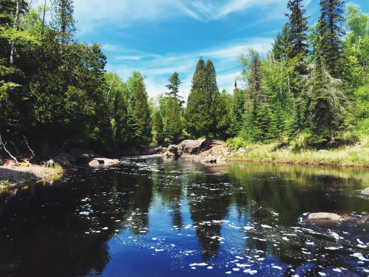 An evening of fishing the upper segments of the river near Finland, Minnesota yielded not-trout fingerlings. The fish were so small that when you would set the hook, you would pull them out of the water and throw them through the air. We’re talking three inches. I hit myself with a fish or two on this segment. Not even the deeper pools on the upper segment were showing much evidence of larger fish. It was time to hit the lower, larger river segment.