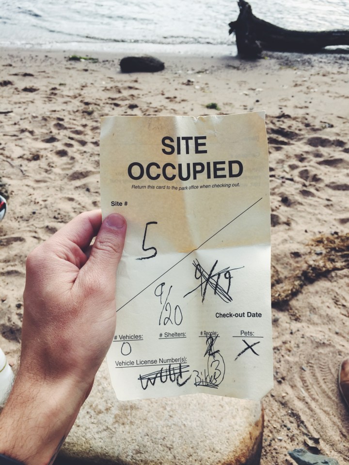 By the time we rolled into the park, it was dark. Our lights led our way. Stars were twinkling, but there was no moon. Fireflies are done this time of year. We cruised winding roads and up and down hills to find the sign at the camp office we feared: “CAMPGROUND FULL.” Again, what’s an adventure without improvisation. Biking the 35 miles back to Minneapolis was not an option. We decided to roll through the campground for an empty site. It isn’t uncommon for a campground to be fully reserved but have open sites because folks didn’t follow through on their reservations. We would have to check each site one by one for an opening. As luck would have it, site #5 of 39 was open.