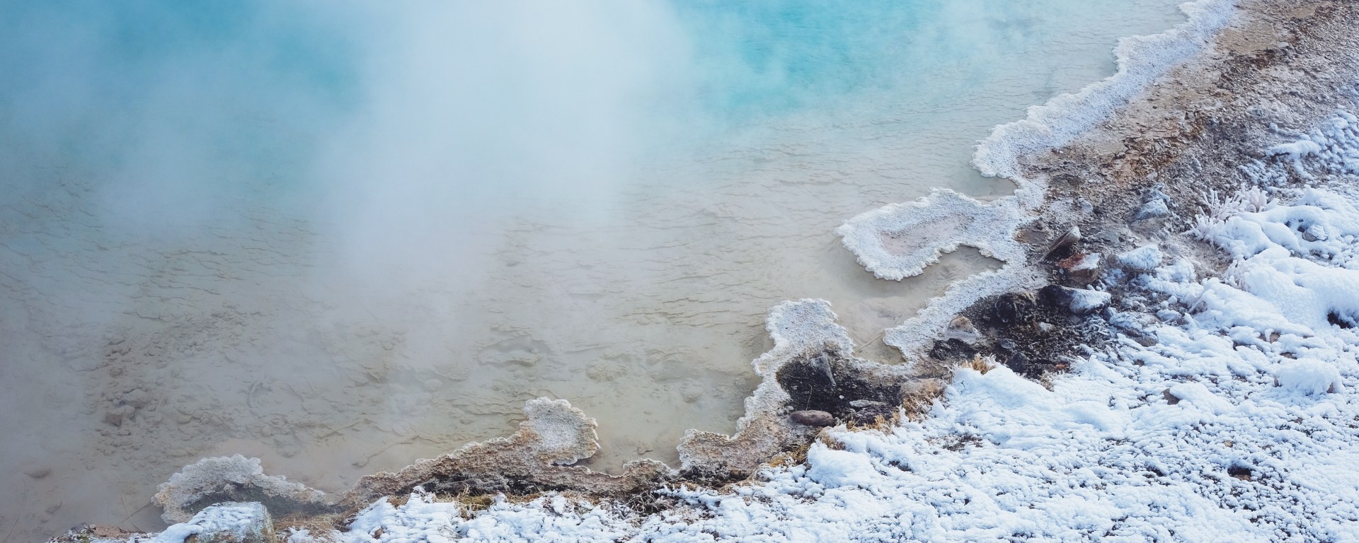 Columns of steam were everywhere, like giant white pins on a map noting a swarm of geothermal features. Red mud boiled at Fountain Paint Pots where we took a quick hiking detour. We could see the pool featured in ‘Death in Yellowstone.’ It was a turquoise by the edge, then faded to a deep blue and finally to a cobalt in the center. The trees that grow next to these geothermals are coated in a hoarfrost thicker than I’ve ever seen.